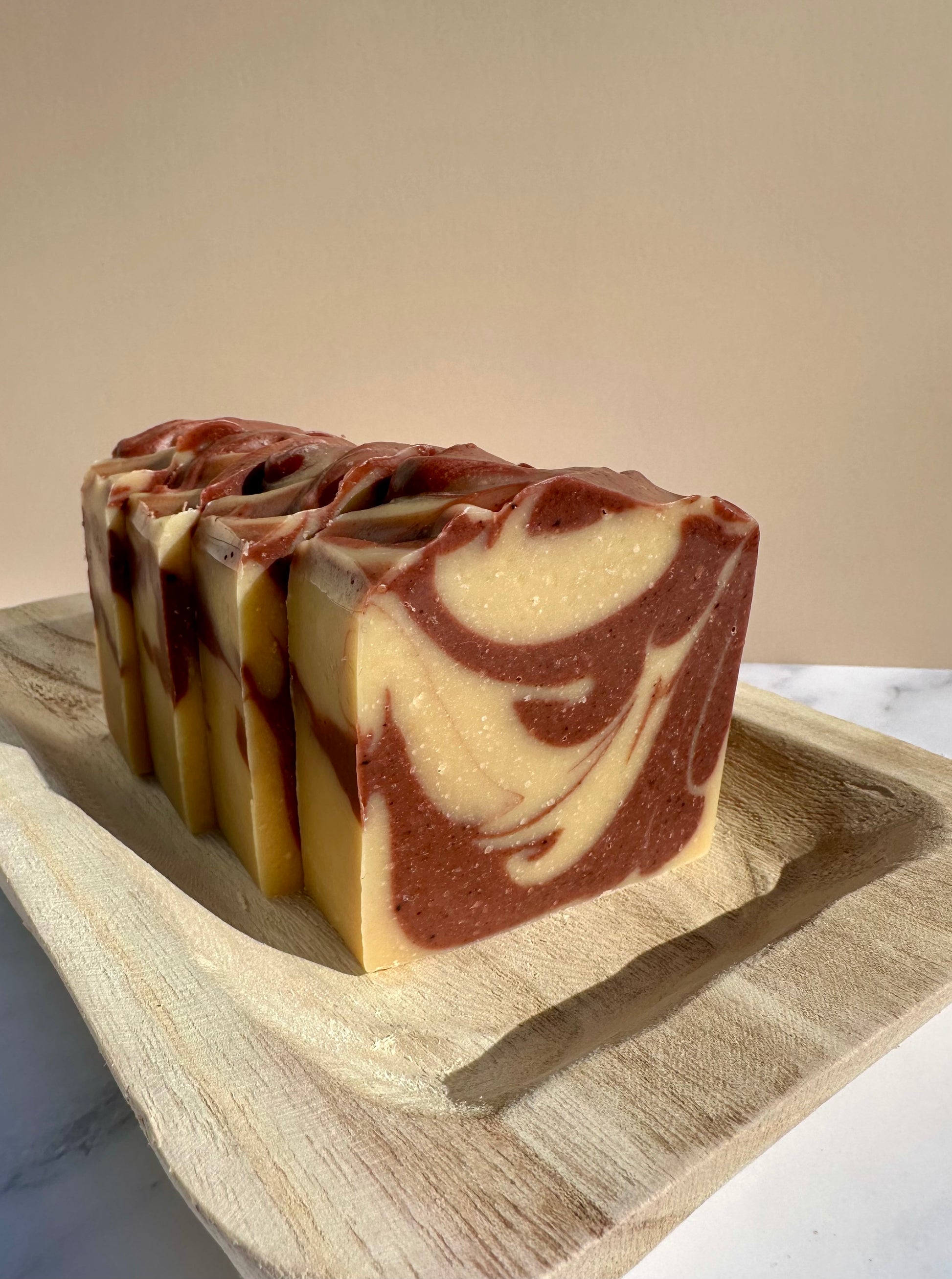 Ingredients: Beef Tallow, Rector Valley Ranch Goat Milk, Olive Oil, Organic Coconut Oil, Sodium Hydroxide (Lye), Castor Oil, Kaolin Clay, Brazilian Red Clay, Rhubarb Powder, Essential Oils: Peppermint, Sweet Orange, Benzoin Resin.